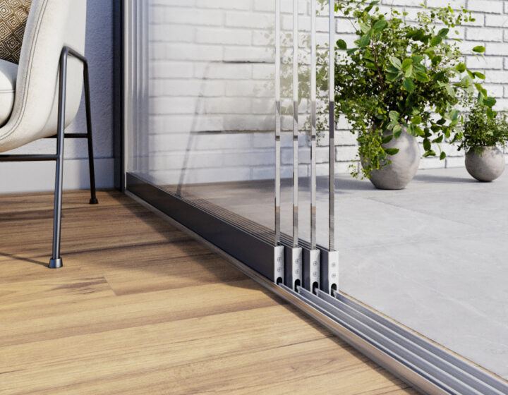 Elke glazen schuifwand is uitgerust met glazen panelen die onafhankelijk over hun eigen rails bewegen.
